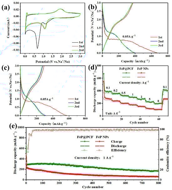 In contrast, the FeP NP electrodes exhibited initial discharge/charge specific capacities of 573.7 and 291.5 mA h g−1, respectively, and an initial Coulombic efficiency (ICE) of only 50.8% (Figure 5c). The performance rates of the FeP@PCF and FeP NP electrodes at various current densities are illustrated in Figure 5d. The FeP@PCF electrode demonstrates impressive reversible specific capacities of 391.2, 361.5, 321.3, 295.3, 276.3, 228.5, and 196.6 mA h g−1 at current densities of 100, 200, 500, 1000, 5000, and 8000 mA g−1, respectively. In comparison, FeP nanoparticles (NPs) exhibit lower specific capacities of 272.4, 237.4, 203.6, 175.1, 148.8, 116.8, and 102.5 mA h g−1 at the same current densities. When the current density is returned to 100 mA g−1, the capacity of the FeP NPs increases to 271.6 mA h g−1. At a higher current density of 1000 mA g−1, the FeP@PCF electrode shows excellent long-cycle stability. As illustrated in Figure 5e, it maintains a discharge specific capacity of 172.4 mA h g−1, even after 800 cycles at a current density of 1 A g−1. In contrast, the capacity of FeP NPs drops sharply to only 59.8 mA h g−1 after the same number of cycles at 1 A g−1. The enhanced electrochemical performance of the FeP@PCF electrode can be attributed to the introduction of a 3D porous carbon framework. This framework not only improves the conductivity of the active material, but also prevents electrode aggregation, resulting in good structural stability during repeated sodium intercalation and extraction processes. The discharge capacity does decrease irreversibly over extended cycling, which may be linked to the gradual wetting of the electrode with the electrolyte and the progressive formation of a solid–electrolyte interphase (SEI) film.