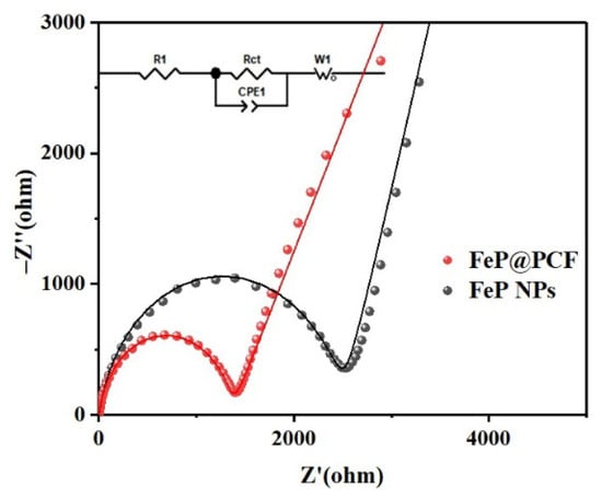 To further compare the electrochemical kinetic properties of FeP@PCF and FeP NPs, electrochemical impedance spectroscopy (EIS) analysis was subsequently conducted [8,36]. As shown in Figure 6, the semicircle in the high-frequency range represents the resistance of the solid–electrolyte interphase (RSEI) and the charge transfer resistance (Rct) at the electrolyte/electrode interface, while the straight line in the low-frequency range signifies the Warburg impedance. The contact and charge transfer resistance (Rct) of FeP@PCF is lower (Rct = 1345 Ω) compared to that of FeP nanoparticles (Rct = 2041 Ω). This indicates that FeP@PCF is a more conductive anode than FeP nanoparticles. This improved conductivity is primarily attributed to the enhanced electrical properties of the carbon nanoframes and the increased specific surface area from the porous structure. Together, these factors effectively promote ion diffusion and accelerate charge transfer.