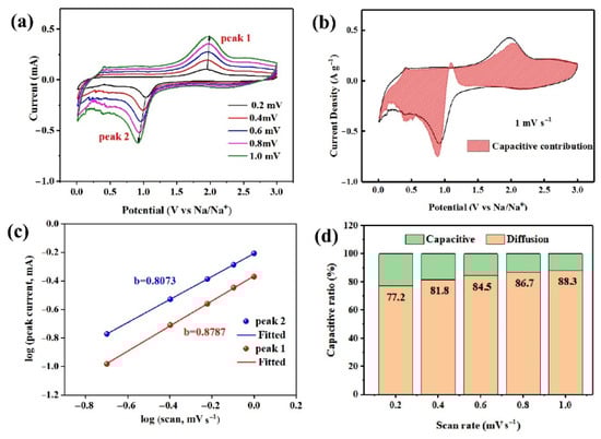 where a and b are both constants. b is given by the slope of log(i) with respect to log(v) [37,38]. In general, the b value is between 0.5 and 1.0, with b = 0.5 indicating a diffusion-dominated process via Na+ intercalation or conversion reactions, and b = 1 indicating a pseudocapacitance-dominated process [39,40,41]. In Figure 7c, the b values of peak 1 and peak 2 are fitted to 0.8073 and 0.8787, respectively, indicating that the kinetic of FeP@PCF is primarily controlled by pseudocapacitive behavior. Furthermore, the capacitive contribution can be represented by