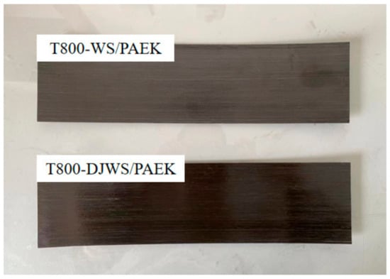 (1) T800-WS and T800-DJWS carbon fibers were used as reinforcing materials, and PAEK resin as the matrix resin. T800-WS/PAEK and T800-DJWS/PAEK prepregs are produced using a hot melt process that involves heating PAEK resin to 343 °C in an extruder, followed by impregnating T800 fibers in a bath of molten resin to achieve uniform coverage. The impregnated fibers are then cooled to cure the resin. After cooling, calendaring rollers refine the resin’s surface to improve fiber–resin adhesion. The glass transition temperatures of both T800-WS and T800-DJWS carbon fibers are indistinguishable, and the finished prepregs are displayed in Figure 1, with the relevant properties shown in Table 3. The prepregs were finalized at a size of 120 × 40 × 0.2 mm.