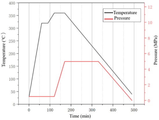 (2) The T800-WS and T800-DJWS prepregs were found to contain epoxy sizing agents. The surface sizing agents were removed through the process of complete immersion in acetone for two hours, followed by washing with deionized water. The curing temperature profile shown in Figure 2 was established in accordance with the PAEK matrix Tm = 317 °C, with the objective of ensuring the material’s fluidity within the mold. The thickness of each specimen was 2 mm.