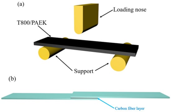 According to the JC/T773-2010 standard [29], the YHS-WE-300B-1 universal testing machine was used to test the interlaminar shear strength of the T800-WS/PAEK and T800-DJWS/PAEK composites. The experimental setup for the interlayer shear test is shown in Figure 3b. Each experimental specimen’s size was 8 × 10 × 2 mm, and the experiment was repeated five times.
