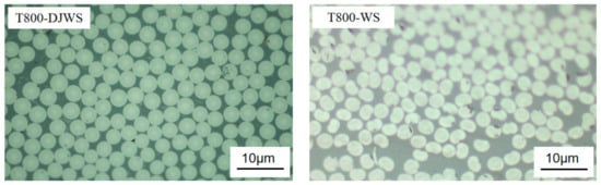 According to the properties of carbon fiber filaments, both dry-jet wet spinning and wet spinning yield similar tensile moduli and elongation. However, T800-DJWS exhibits a 9.3% higher tensile strength than T800-WS. To analyze this further, the sizing agent was removed from the fibers’ surfaces using a solvent, and their microscopic surfaces were examined using a scanning electron microscope. Figure 4 illustrates that the T800-DJWS filament bundle has a smoother surface compared to the rough and uneven surface of the T800-WS filament bundle, highlighting a significant difference between the two processes. In the spinning process, dry-jet wet spinning introduces an air layer that forms a dense protective layer on the fiber surface upon extrusion from the nozzle, thus minimizing surface wear. Consequently, fibers produced by dry-jet wet spinning have smoother surfaces and higher tensile strength than those produced through wet spinning. Figure 5 displays gold micrographs of the fibers’ cross-sections, where T800-DJWS features a uniform filament distribution and a circular cross-section, in contrast to T800-WS’s dispersed and uneven distribution and its oval or pea-shaped cross-section. During wet spinning, lacking an air layer’s protection, fibers often cling to the filament bundle’s outer edge due to electrostatic forces. Subsequently, the outer filament bundle becomes dense, while the inner bundle remains loose. However, dry-jet wet spinning mitigates electrostatic adhesion under the air layer’s protection, leading to more uniform fiber distribution post-spreading. Moreover, the significant friction in wet process fibers results in elliptical or pea-shaped cross-sections, rather than irregular and circular ones.