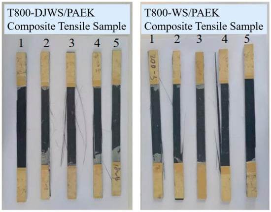 T800-DJWS/PAEK and T800-WS/PAEK composite samples that experienced tensile test failure.
