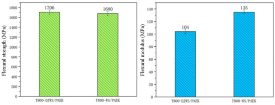 As demonstrated in Figure 7, the tensile strength of T800-DJWS/PAEK composites is considerably higher than that of T800-WS/PAEK composites, reaching 2816 MPa. The tensile strength of T800-DJWS/PAEK composites exceeds that of T800-WS/PAEK composites, which is 706 MPa. Figure 8 illustrates that the failure patterns of the T800-DJWS/PAEK and T800-WS/PAEK tensile samples are similar, primarily characterized by fiber tensile failure. Upon applying a tensile load, the fiber and resin matrices in the composites undergo plastic deformation. The extension rates of both fibers are similar and lower than that of PAEK, resulting in nearly identical tensile modulus values for the composites. The failure analysis of the tensile samples indicates that the fibers break before the resin. Consequently, the tensile test ceases before the resin matrix sustains extensive damage. Consequently, the tensile strength primarily depends on the comparative tensile strength of the fibers. Table 1 compares the performance of the fiber filaments, indicating that the T800-DJWS fiber has higher tensile strength than the T800-WS fiber. Consequently, the T800-DJWS/PAEK composite exhibits superior tensile strength compared to the T800-WS/PAEK composite.