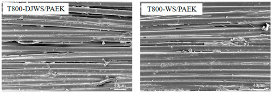 Two types of carbon fiber fabrics were converted into 100 mm wide prepregs using the hot melt method, as depicted in Figure 1. Visually, both prepregs appeared similar in quality, without evident issues like excess or insufficient resin, gaps, fuzz balls, or folds. The consistent prepreg fabrication process does not compromise the quality of the prepregs or introduce local defects. Figure 6 presents a cross-sectional view of the prepreg. The T800-WS/PAEK prepreg, based on T800-WS, displays notable local defects such as resin deficiency and excess. Conversely, the T800-DJWS/PAEK prepreg, based on T800-DJWS, shows a uniform resin and fiber distribution with no significant gaps. In the T800-WS/PAEK prepreg, the fibers are loosely arranged, mirroring the distribution in a single T800-WS fiber bundle. The external surface of this bundle is resin-rich, whereas the internal area lacks resin, or, conversely, the internal area is resin-rich and the external surface has less resin. In the prepreg fabrication process, hot melt resin is applied to the fiber surface using the impregnator’s squeeze head, then rolled with a high-temperature heating roller. When fibers in the bundle are unevenly dispersed, the viscous resin flows and accumulates in areas of looser fiber distribution within the cross-section. The remaining resin is applied to the fiber bundle’s surface; however, due to the minimal resin content and low squeezing force, the internal fibers are not fully impregnated, resulting in resin-rich outer fibers and poorly impregnated internal areas. The T800-DJWS fibers are uniformly distributed, resulting in a consistent resin and fiber arrangement in the prepreg, with virtually no issues of insufficient resin or bonding.