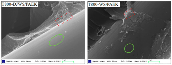 Interlaminar shear tests are primarily used to evaluate the bond strength between fibers and resin in composite materials. The rougher surface of wet carbon fibers increases the contact area and enhances mechanical interlocking between the fibers and resin in the microstructure. Consequently, this improves interfacial bonding between the resin and fibers during the mechanical hot-pressing process. However, the presence of an epoxy sizing agent causes the PAEK matrix to bind to this agent on the fiber’s surface during curing instead of directly to the carbon fiber. The epoxy sizing agent is crucial for preventing damage, enhancing processability, improving interfacial adhesion, and ensuring a uniform, robust bond between the PAEK matrix and the fibers. A prerequisite for this effect is that the sizing agent on the carbon fibers must be compatible with the matrix resin. For epoxy resin matrices, epoxy sizing agents are appropriate, whereas specifically developed thermoplastic sizing agents are required for thermoplastic resin matrices. Using traditional epoxy sizing agents typically results in a weaker bond between carbon fibers and resin. Both of the domestic T800-level carbon fibers prepared via the two processes utilize epoxy resin as a sizing agent, resulting in their similarly weak interlaminar shear strengths, as depicted in Figure 11. Figure 12 displays an electron microscope image of the failure interface for a single fiber from each the composites prepared by both carbon fiber processes. The sizing agent’s presence results in no significant roughness differences on the fiber surfaces. Both samples feature fibers (the symbol in question is a green oval) well-adhered with resin (the object in question is a red rectangular box with a dashed outline), without evident delamination, indicating uniform and ideal bonding conditions between the resin and the fibers and, thus, consistent interlaminar shear strength.