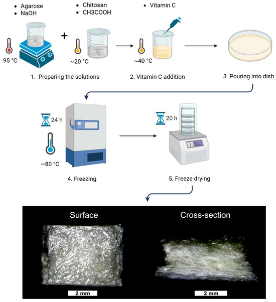 Chitosan polymer with three different molecular weights was used: low molecular weight (75.8 kDa, 79.0% ± 1.0% deacetylation degree), medium molecular weight (140.5 kDa, 84.2% ± 0.3% deacetylation degree), and high molecular weight (247.8 kDa, 81.8% ± 0.1% deacetylation degree) (Sigma-Aldrich Chemicals, Warsaw, Poland) [18]. To prepare a 3% chitosan solution, the chitosan powder was dissolved in 0.5% (v/v) acetic acid (CH3COOH) (Polskie Odczynniki Chemiczne S.A, Gliwice, Poland) and stirred at room temperature in glass beakers for approximately 30 min to fully dissolve. A 4% agarose suspension was prepared (Sigma Aldrich Chemicals, Warsaw, Poland) in 0.1% (w/v) sodium hydroxide (NaOH, Polskie Odczynniki Chemiczne S.A, Gliwice, Poland). The suspension was then heated on a hotplate stirrer at 95 °C for 10 min until fully dissolved. A vitamin C stock solution (L-Ascorbic acid 2-phosphate sesquimagnesium salt hydrate, Sigma Aldrich Chemicals, Warsaw, Poland) was prepared at a concentration of 40 mg/mL using ultrapure water obtained from a Milli-Q® Water Purification System (Merck, Warsaw, Poland). Chitosan and agarose solutions were mixed in a 1:1 volume ratio, resulting in a final concentration of 1.5% (w/v) chitosan and 2% (w/v) agarose. For materials containing vitamin C, the vitamin C stock solution was added when the mixed polysaccharides solution reached a temperature of approximately 40 °C, yielding a final concentration of 200 µg/mL in the homogeneous mass. The prepared compositions were then poured into a polystyrene Petri dish (Bionovo, Legnica, Poland) to form a uniform layer approximately 2 mm thick. All samples were then frozen at −80 °C for 24 h and lyophilized under a vacuum of 1 mbar (LYO GT2-Basic, SRK Systemtechnik GmbH, Riedstadt, Germany) for 20 h. All stages of production were carried out using sterile reagents under sterile conditions in a laminar flow cabinet (Esco Lifesciencies GmbH, Friedberg, Germany). Figure 1 shows a scheme of production steps of chitosan-based foams. The optimization of sample preparation was developed and described in the previous work [19].