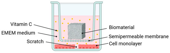 To evaluate the effect of biomaterials on cell migration, a wound healing assay (scratch assay) was performed. Cells were seeded into a 24-well plate at a concentration of 2 × 105 cells/mL and incubated for 3 days until a confluent monolayer was formed. Uniform scratches were created in each well using a BioTek AutoScratch device (Agilent Technologies, Santa Clara, CA, USA). Small samples of biomaterials (2 mm × 2 mm) were placed into the wells using cell culture inserts (Greiner Bio-One, Kremsmünster, Austria). To ensure full submersion of the materials, 1.1 mL of culture medium was added to each well. Wells without inserts served as the control group. Then, the cells were cultured for 48 h under standard conditions. Images of the scratches were made and captured using Celloger® Mini Plus (Curiosis Inc., Seoul, Republic of Korea) at three time points: immediately after scratching (0 h), after 24 h, and after 48 h. Cell confluence within the scratch area was analyzed using dedicated software (CellogerMiniPlus V2.1.2023.0512). Wound closure for each tested biomaterial was measured as a percentage of the scratch area populated with cells after incubation. Cells were cultured at 24 and 48 h with the tested biomaterials or pure culture medium (in the case of the control group) using cell culture inserts and a two-compartment environment. A schematic representation of the experiment conditions is shown in Figure 2.
