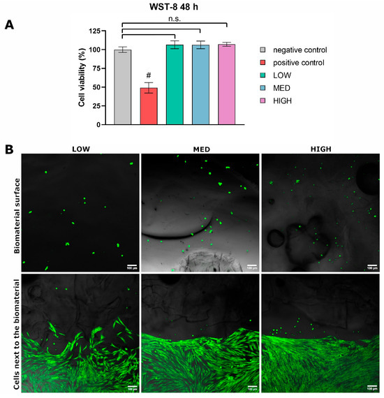 Moreover, no statistically significant differences were observed between the LOW, MED, and HIGH samples. The viability was high (approximately 100%), indicating non-toxicity according to ISO 10993-5 [20], which defines cytotoxicity as a reduction in cell viability below 70% compared to the negative control. To estimate cytotoxicity in direct contact with the biomaterials and access cell adhesion preference, cells were cultured directly on the LOW, MED, and HIGH samples. After 3 days of cells culturing, BJ cells were visualized with Live/Dead staining. In all tested samples, no dead cells (stained in red) were detected. It should be noted that cells seeded next to the biomaterials on the polystyrene surface possessed normal morphology, which confirms the lack of cytotoxicity (Figure 3B). Furthermore, green, spherical, non-flattened cells were present on the biomaterial surface, suggesting that the BJ cells were viable but not attached to the top surface of the samples.