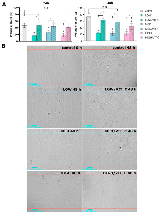 Figure 4. Wound healing assay: (A) percentage of the scratch area covered by migrating cells; (#) above the bars indicates statistically significant differences compared to the control; (*) indicates pairwise comparisons, p < 0.05, one-way ANOVA followed by Tukey’s test; and (n.s.) indicates statistical non-significance, p > 0.05. (B) selected images of the scratched areas captured by Celloger® Mini Plus right after the scratching (0 h) and 48 h post-scratching; red lines indicate the scratch borders.