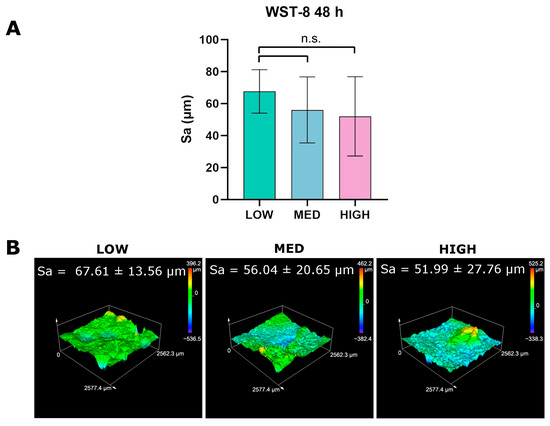 Figure 5. Surface roughness analysis: (A) graph showing the mean areal surface roughness (Sa), defined as the arithmetic mean height of the surface area; (n.s.) indicates statistical non-significance p > 0.05. (B) Representative 3D views of the scanned areas measuring 2.6 mm × 2.6 mm.