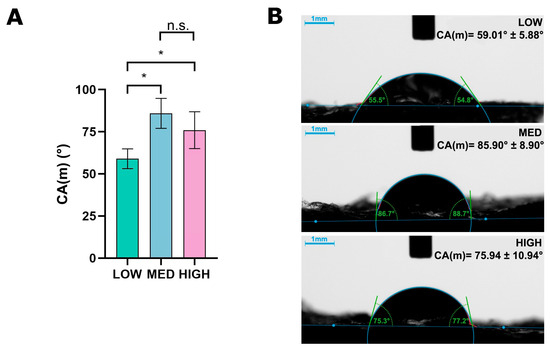Figure 6. Wettability analysis of produced biomaterials: (A) mean values of contact angles between water droplet and biomaterial surface; (*) indicates pairwise comparisons, p < 0.05, one-way ANOVA followed by Tukey’s test; and (n.s.) indicates statistical non-significance p > 0.05. (B) Images of a water droplet on the biomaterial surface, with the measured contact angle marked by green lines.