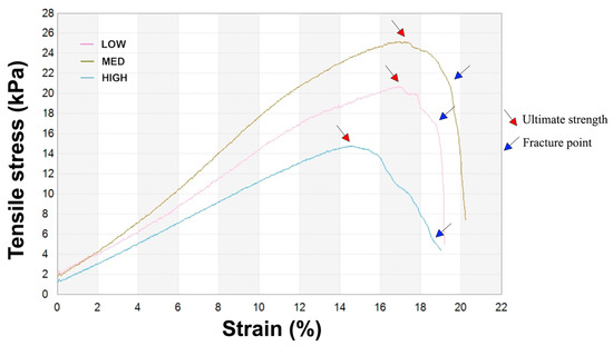 The mechanical properties of biomaterials are crucial for ensuring protective functionality, comfortable handling, application, and resistance to wear [30]. The prepared foams are intended to be used on exudative wounds, therefore the mechanical properties were evaluated in the wet state, as this better reflects the moist environment of a healing wound. Measured parameters included tensile strength, elongation at break, and Young’s modulus to characterize samples’ stiffness and elastic behavior (Table 2). Figure 7 presents the stress–strain curve of three representative samples.