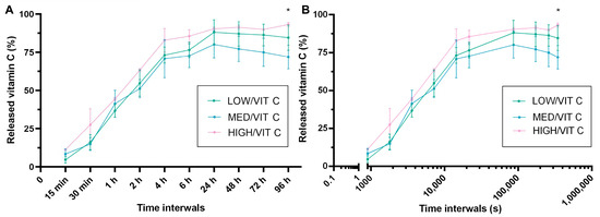 Figure 9. The amount of the released vitamin C presented as a percentage of the initial content, calculated individually for each tested sample: (A) time intervals presented as selected experimental points and (B) time intervals presented on a logarithmic X-axis. (*) indicates statistically significant differences between HIGH/VIT C and MED/VIT C, p < 0.05, one-way ANOVA followed by Tukey’s test.