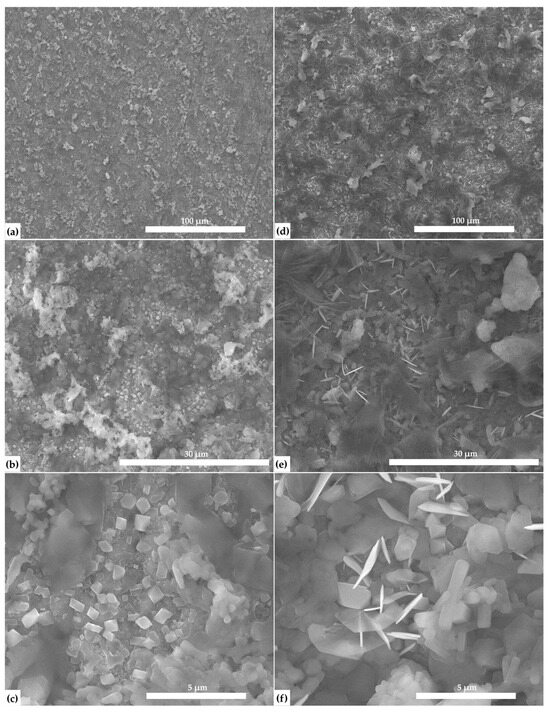 SEM images of 45S5 bioactive glass coatings doped with Sm (a–c) and coatings additionally functionalized with benfotiamine (d–f), at different magnifications.