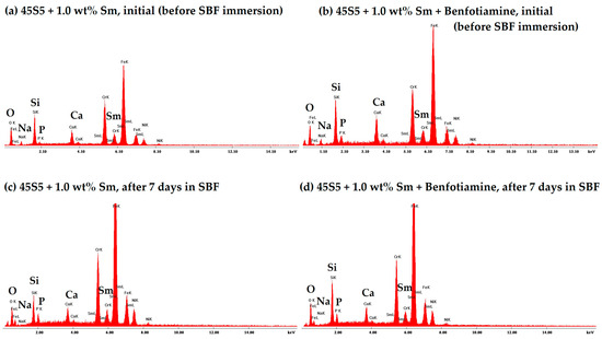 In order to confirm the presence of the characteristic elements of the bioactive glass, to demonstrate the incorporation of samarium into the coating composition, and to monitor the chemical changes associated with CaPs formation after immersion in SBF, energy-dispersive X-ray spectroscopy (EDS) analysis was performed. Representative spectra of the coatings, recorded both before immersion and after 7 days in SBF, are shown in Figure 3 while the semi-quantitative data are listed in Table 2.