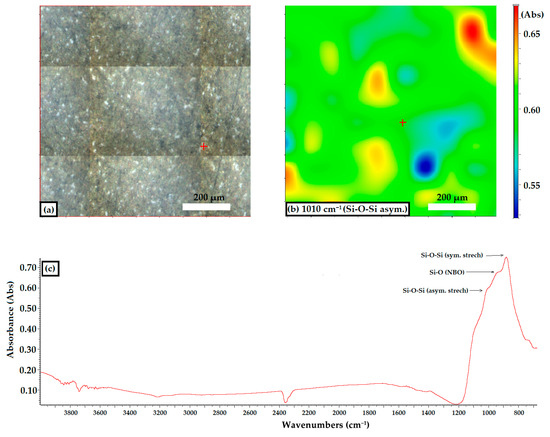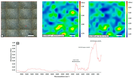 The image from Figure 4b represents the FTIR transmittance map recorded at ~1010 cm−1, corresponding to the Si–O–Si asymmetric stretching band. It indicates slight variations in surface absorption, reflecting possible minor fluctuations in the thickness of the glass layer. The dominant colors (green, yellow) suggest a relatively uniform distribution of the chemical composition, with some areas with lower absorption (blue) or higher absorption (red), depending on the color scale adjacent to the image.