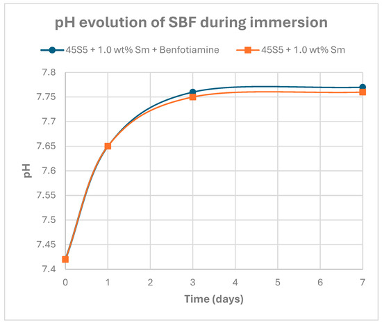 pH evolution of SBF solution during immersion of Sm-doped 45S5 coatings, with and without benfotiamine functionalization, for 1, 3, and 7 days at 36 ± 1 °C.