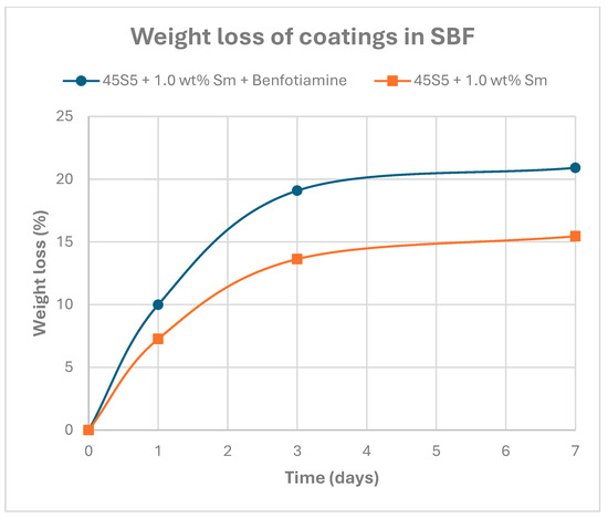Weight loss of Sm-doped 45S5 coatings, with and without benfotiamine functionalization, after immersion in SBF for 1, 3, and 7 days at 36 ± 1 °C.