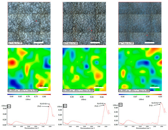 The FTIR absorbance maps at 1060 cm−1 (Figure 8b,e,h) reflect the distribution of phosphate groups on the surface, providing an indirect picture of the formation of CaPs. The colors on the map indicate the level of absorbance, where red corresponds to a higher absorption (thicker layer of phosphate compound), and blue to a lower absorption. In all three cases, the local variation in absorbance values is relatively small, which suggests a uniform deposition of the reaction product over the entire analyzed area. The presence of phosphate groups is noted from the first day, and the signal intensity remains well-defined even after 3 and 7 days, which confirms the progressive formation of a phosphate-rich layer.