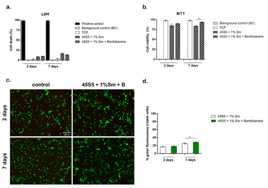The Live/Dead staining, coupled with fluorescence microscopy, allowed the qualitative visualization of cellular distribution, morphology, and viability after 2 and 7 days of cell culture in contact with the tested coatings. After 2 days of incubation, fluorescence microscopy images showed an increased cellular growth and viability on bothSm-doped bioactive glass coatings, indicating that the metal composites coated with 45S5 bioactive glasses doped with 1.0 wt% Sm, with or without benfotiamine, support cellular proliferation and viability. We previously demonstrated that the incorporation of 1.0 wt% Sm into bioactive glasses resulted in an increased cell proliferation [18]. Moreover, after 7 days of in vitro cell culture, a higher cellular density and proliferation rate were observed in both composites, with the highest density reported at the level of benfotiamine-supplemented composites, compared to the control (Figure 9c). In addition, cells exposed to benfotiamine were observed to form aggregates after 7 days of culture. These results were further demonstrated by calculating the percentage of area covered by green fluorescence. After 7 days of culture, a statistically significant increase in fluorescence intensity was observed in cells in contact with 45S5 Sm-doped bioactive glass supplemented with benfotiamine, compared to coatings without benfotiamine (p < 0.05, Figure 9d). These data align with the MTT and LDH results. Therefore, the addition of benfotiamine to Sm-doped 45S5 bioactive glass coatings on stainless steel discs could potentially support cell viability and enhance their applicability in bone regeneration.