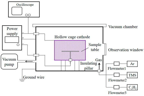 For the Si-DLC coating, it was synthesized using a cage-type hollow cathode discharge technique. Figure 1 shows the schematic of the experimental setup. High-purity argon (99.99%) and acetylene (99.00%) served as working gases. Tetramethylsilane (TMS, purity > 99.9%), an organic liquid with a boiling point of 17 °C, was stored in a sealed stainless steel tank and vaporized using a water bath. All gas flows were regulated by mass flow controllers.