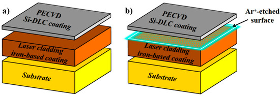 Therefore, this study employs laser cladding technology to fabricate Fe-Cr-based alloy cladding layers with three different hardness levels on medium carbon steel substrates serving as interlayers. The surface modification effects of Ar+ etching treatment on these specimens are systematically investigated. Subsequently, Si-DLC coatings are deposited using plasma-enhanced chemical vapor deposition (PECVD). This work aims to quantitatively evaluate the coating–substrate adhesion strength via scratch testing, focusing on elucidating the synergistic influence between the hardness of the Fe-Cr-based interlayer and the Ar+ etching process on the adhesion of the Si-DLC coating. The findings are expected to provide novel insights and a solid experimental basis for preparing high-performance, strongly adherent DLC composite coatings on soft steel substrates.