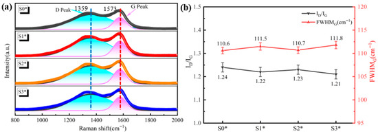 Structural characterization of the Si-DLC coating. (a) Raman spectra, (b) ID/IG ratio, and FWHM of G-band.