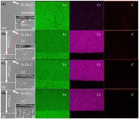 Figure 4 shows the SEM images and corresponding EDS elemental maps: Figure 4a, S0, a Si-DLC coating deposited directly on a medium carbon steel substrate; and Figure 4c S1–S3, composite coatings with ≈1.5 mm LC layers. The LC layers exhibit dense microstructures and display sound metallurgical bonding to the substrates. The Si-DLC coating adheres well to the LC layer without interfacial cracking.
