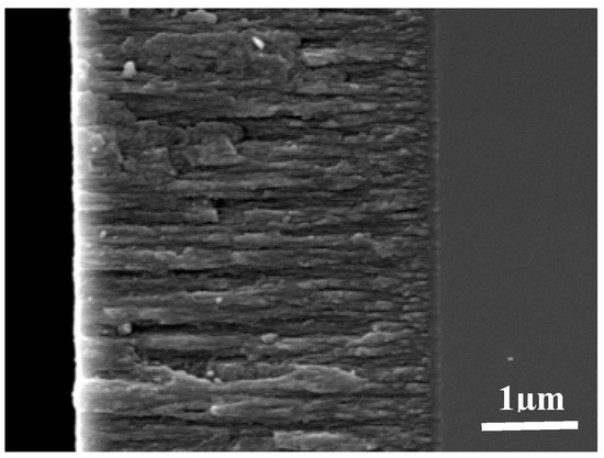 Figure 5 shows a cross-sectional SEM image of the Si-DLC coating deposited on a Si wafer, revealing its columnar upward growth. During deposition, the morphology of the Si-DLC coating is primarily governed by the migration of adsorbed atoms. In this study, the Si-DLC coatings were deposited using cage-shaped hollow cathode technology. Here, the limited potential difference (10–20 eV) [28] between the specimens and the surrounding plasma restricts adatom mobility, resulting in coarse columnar microstructures. As depicted in Figure 5, the coating thickness was approximately 3 μm after 30 min deposition, corresponding to a deposition rate of approximately 6 μm/h.