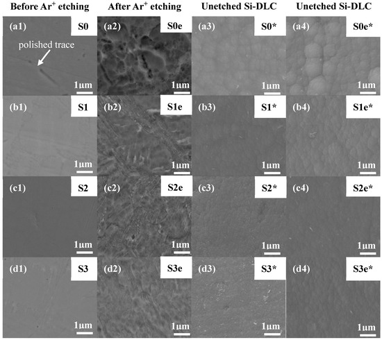 Surface topography of substrate before and after Ar+ etching and Si-DLC coatings. (a1–a4) S0 S0e S0* S0e*; (b1–b4) S1 S1e S1* S1e*; (c1–c4) S2 S2e S2* S2e*; (d1–d4) S3 S3e S3* S3e*.