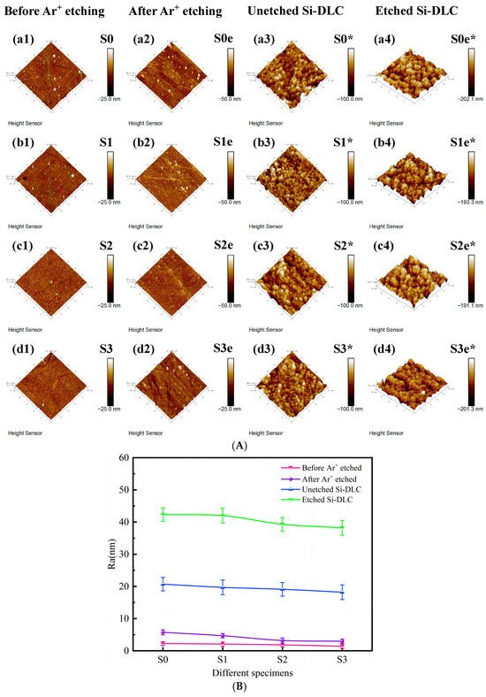 Figure 7 shows the AFM morphology and roughness results of different specimens’ surfaces. As shown in Figure 7A(a1–d1), grinding marks by sandpaper can be observed on the S0–S3 specimens’ surface. The surface roughness values of S0 to S3 are 2.22 nm, 2.08 nm, 1.82 nm, and 1.41 nm, respectively. As shown in Figure 7A(a2–d2), after Ar+ etching with an applied bias voltage of −200 V, the surface grinding marks became relatively flat and smooth. Significant changes occurred on the substrate surface, with clearly visible nano-scale protrusions. The sandpaper grinding marks gradually disappeared. The surface roughness values for S0e to S3e are 5.72 nm, 4.67 nm, 3.21 nm, and 2.95 nm, respectively. As shown in Figure 7A(a3–d3,a4–d4), the surface roughness values of unetched Si-DLC coatings are 20.7 nm, 19.7 nm, 19.1 nm, and 18.2 nm, respectively. In contrast, the surface roughness values of Si-DLC coatings after Ar+ etching are 42.3 nm, 41.1 nm, 39.3 nm, and 38.2 nm, respectively. It can be concluded that the surface roughness of Si-DLC coatings after Ar+ etching is higher than that of unetched Si-DLC coatings. This replication occurs because the amorphous Si-DLC coating grows conformally along the substrate surface, ultimately adopting a similar morphology.