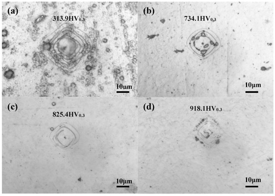As shown in Figure 9, S0e* displayed the largest indentation diagonal (approximately 30 μm), corresponding to its lowest hardness value of 314 HV0.3. From S1e* to S3e*, the indentation size gradually decreased while the hardness consistently increased, reaching a peak value of 918 HV0.3 in S3e*. This trend mirrors the hardness variation in the substrate. The observed behavior can be attributed to the 300 gf test load exceeding the critical limit for the 3 μm thick Si-DLC coating, causing the indentation to penetrate entirely through the coating layer. As a result, the measured microhardness primarily reflects the substrate’s hardness variation.