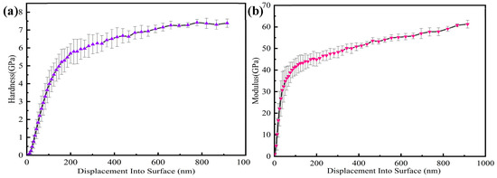 Figure 10 shows the nanohardness and modulus curves. The maximum indentation depth (0.3 μm) is approximately one-tenth of the coating thickness, indicating that the measurement reflects the actual hardness of the coating. The nanohardness of the coating prepared in this experiment is 5.9 GPa, which is lower than the values reported in the literature [29]. This is because the potential difference between the workpiece and the surrounding plasma is only a few eV, resulting in low-energy ions reaching the workpiece surface, as illustrated in Figure 5 of Section 3.2.