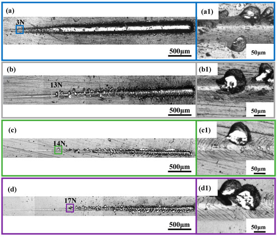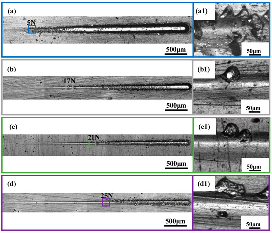 Scratch morphology of Si-DLC coatings deposited on unetched surface. (a,a1) S0*; (b,b1) S1*; (c,c1) S2*; (d,d1) S3*.