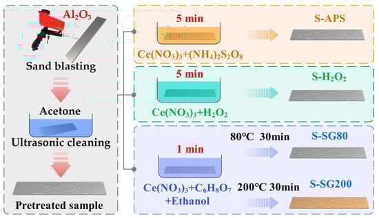 The chemical treatment, including sand blasting, ultrasonic cleaning, and chemical coating application, is depicted in Figure 1. The process starts with the sandblasting of the high-pressure die-cast aluminum AlSi10MnMg samples. This stage is followed by ultrasonic cleaning in acetone. Aluminum oxide grit serves as the abrasive medium for sandblasting. Sandblasting conditions were selected based on industry standards for HPDC aluminum surface roughening, where 8 bar pressure ensures sufficient roughness for mechanical interlocking without damaging the substrate [25,26]. Maintaining a 10 cm distance between the nozzle and the HPDC aluminum surface ensures consistent abrasion across the entire specimen. A 45° angle relative to the horizontal was selected for the nozzle. This orientation promotes even distribution of abrasive particles across the surface. Sandblasting duration was standardized at 60 s per sample. After sandblasting, the samples are rinsed and then subjected to ultrasonic cleaning in acetone. The ultrasonic cleaning parameters were established at a power of 400 W and a frequency of 40 kHz. Each sample receives 10 min of ultrasonic treatment. The temperature of the solution during cleaning is maintained below 40 °C. Cerium-based conversion coatings were chosen for their non-toxicity and cathodic inhibition effect. Three different chemical solutions are then used to coat the samples at room temperature. These include an APS solution (0.1 M Ce(NO3)3 + 0.1 M (NH4)2S2O8 + ethanol) applied for 5 min, an H2O2 solution (0.1 M Ce(NO3)3 + 0.1 M H2O2 + ethanol) also applied for 5 min, and a sol–gel solution (0.1 M Ce(NO3)3 + 0.1 M C6H8O7 + ethanol) applied for 30 s [27,28,29]. Final processing involves drying the chemically treated samples. One group labeled S-SG80 is dried at 80 °C for 30 min. Another group consisting of sol–gel-coated samples and labeled S-SG200 undergoes drying at 200 °C for 30 min. The respective designations for samples treated with APS, H2O2, and sol–gel solutions are S-APS, S-H2O2, S-SG80, and S-SG200. Each schematic shows deoxidized samples immersed in their particular solutions. The figures provide a detailed overview of the chemical composition of each solution, as well as the expected surface reactions. The APS and H2O2 solutions are engineered to produce cerium-based chemical coatings.