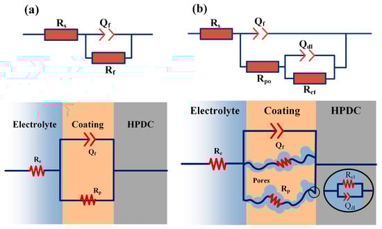 Model A, shown in Figure 3a, was developed to interpret electrochemical impedance spectroscopy recorded before the active electrochemical processes began [32]. In this model, Rs represents the solution resistance. For high-pressure die-cast aluminum, only one layer exists, which was defined by two parameters: oxide film resistance Rf and oxide film capacitance Qf. Herein, constant phase elements (CPEs) are included to obtain more correct fitting results. These elements account for the system’s non-ideal capacitive behavior, represented here as Qf and Qdl. The mathematical expression for a CPE is as follows: