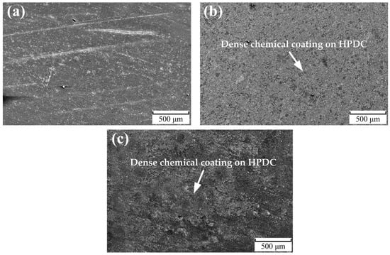 SEM micrographs for AlSi10MnMg samples: (a) substrate, (b) with APS solution treatment, and (c) with H2O2 solution treatment.