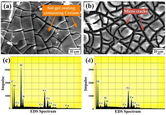Figure 5a,b display SEM micrographs that illustrate the surface morphology of cerium oxide films on the S-SG80 and S-SG200 samples, respectively. Both micrographs reveal that the films fully cover the surface of the AlSi10MnMg substrate, demonstrating a complete surface coverage. However, a notable feature of these sol–gel coatings is the presence of microcracks, a common issue associated with dense sol–gel film formation [34]. These microcracks result from shrinkage that occurs during the drying process of the sample. During thermal treatment, water evaporation from the coating induces shrinkage, which generates internal stress that ultimately leads to cracking. The parameters influencing sol–gel coating formation of temperature, curing conditions, and heat treatment play important roles in crack development [35] and will be further elucidated.