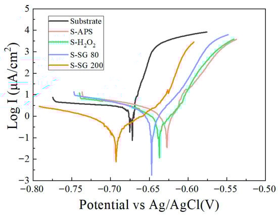 Potentiodynamic polarization curves in a 3.5 wt.% NaCl solution for AlSi10MnMg substrate and AlSi10MnMg subjected to various chemical treatments.