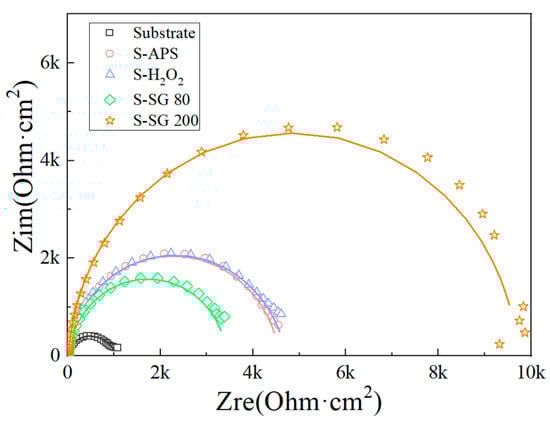 A notable aspect of Figure 7 is the Nyquist plot for the S-SG200 sample. It reveals an arc indicating a continuous protective sol–gel film acting as the main corrosion barrier. This stands in clear contrast to the plots of other samples (S-APS, S-H2O2, and S-SG80), which exhibit smaller, less distinct semicircles throughout the entire frequency range. These samples consist of two separate capacitive loops: a high-frequency loop associated with the properties of the oxide layer and a low-frequency loop corresponding to interfacial reactions between the coating/oxide layer and the underlying alloy substrate.