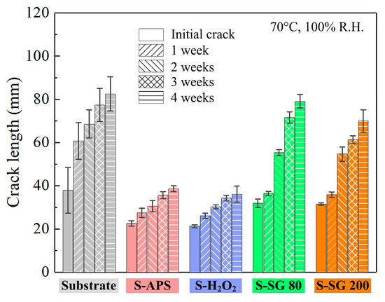 Aging tests were performed at 70 °C and 100% relative humidity for four weeks in order to cause the crack to develop, which is shown in Figure 8. However, when compared to the untreated sample, treated samples generally kept shorter total crack lengths. Post-aging measurements revealed varying propagation degrees: the substrate sample showed a significant crack extension, with the total length increasing to approximately 82.44 ± 7.87 mm, while APS-treated and H2O2-treated samples retained relatively compact crack lengths at 38.63 ± 1.34 mm and 36.08 ± 3.75 mm, respectively. The H2O2-treated sample continued to exhibit the shortest total crack length after aging, with minimal propagation from its initial measurement, followed by the APS-treated sample. In contrast, SG80-treated and SG200-treated samples displayed more extensive post-aging crack growth, with SG80 showing the longest total crack length (79.13 ± 3.15 mm) among all treated groups. These results, supported by crack length comparisons in Figure 8, demonstrate that H2O2 treatment provides the most durable adhesion according to the minimal initial cracking and limited propagation under both pristine and aged conditions. This enhanced performance stems from hydrogen peroxide’s oxidative action on the HPDC aluminum surface, which forms a dense chemical coating. This layer acts as a barrier against moisture ingress and prevents bonding degradation over time. Intermediate aging measurements revealed key trends in crack propagation behavior. The untreated substrate showed rapid crack growth in the first 2 weeks and slowed thereafter, indicating early moisture penetration and bond degradation. S-H2O2 samples exhibited a stable crack growth, confirming that the H2O2-treated surface forms a durable moisture barrier that delays degradation. S-SG200 samples showed an abrupt crack extension between 2 and 3 weeks, likely due to microcrack propagation in the sol–gel coating allowing electrolyte ingress. These intermediate data confirm that S-H2O2 not only has the shortest final crack length but also maintains a stable bonding performance throughout aging. The H2O2 treatment can be a promising approach for improving adhesive joint durability in HPDC aluminum, particularly in harsh environments.