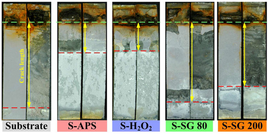 Figure 9 presents the fracture images of chemically treated samples (S-APS, S-H2O2, S-SG80, S-SG200) alongside a control sample subjected to sandblasting and acetone degreasing. These images, combined with the wedge test crack length data, reveal distinct failure modes: cohesive failure, interfacial failure, and mixed failure. The S-APS and S-H2O2 samples, which exhibited full cohesive failure in the wedge tests, were further evaluated for environmental durability by exposing the bonded specimens to extreme conditions (70 °C, 100% relative humidity) for four weeks. As shown in Figure 8, post-aging wedge test measurements confirmed minimal crack extension for these samples. It presents cohesive failure modes despite harsh exposure and indicates robust environmental stability.