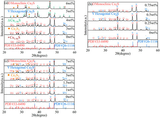 The diffraction peaks of Cu2S are shifted with the increase of Ce2S3 addition at 600 °C (as shown in Figure 2c). Similar to 400 °C and 500 °C, the characteristic peak of pure Cu2S sintered at 600 °C corresponds to hexagonal and monoclinic structures. Unlike 400 °C, when the addition of Ce2S3 was 3 wt%, 5 wt%, and 7 wt%, the characteristic peaks of Ce2S3 were observed, but Cu1.96S and Cu1.8S were not formed, which is related to high-temperature sulfur loss. Compared to pure Cu2S, the diffraction peaks of Ce2S3-Cu2S are shifted to the left, which may be related to the lattice distortion caused by Ce2S3 addition. The similar hexagonal structure of Zn-doped Cu2S was confirmed by the CBD method [27]. An increase in Ti dopant concentration caused an increase in the crystallite size of Ti-doped CuS, which is different from Ce2S3-doped Cu2S [28]. Mn and Se co-doping is similar to Ce2S3-doped Cu2S, but there is a doping concentration limit of 0.05 [9].