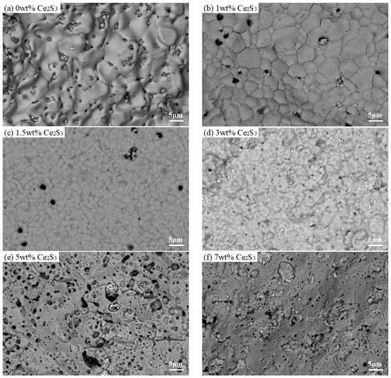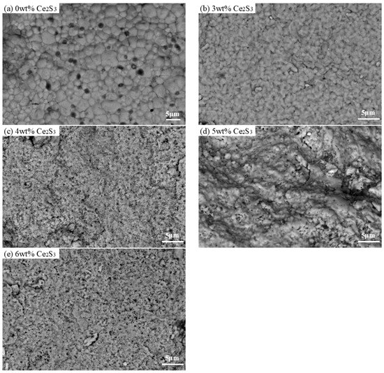 Figure 3 shows SEM images of Ce2S3-Cu2S sintered at 400 °C. The sintered Cu2S exhibits an irregular oval shape with an average particle size in the range of 1.5–3 µm. The particle size of sintered Cu2S is smaller than that of ball-milled Cu2S powders (15 µm [31]. At low Ce2S3 addition (lower than 4 wt%), the Ce2S3-Cu2S has a relatively uniform structure, while as the Ce2S3 content increases to 5 wt%, the mixing of the Ce2S3 phase and Cu2S phase becomes non-uniform. On the other hand, the surface of the Ce2S3-Cu2S composite becomes rough and agglomerated, while finer particles emerge at 3 wt%. Optical microscope images of the surface of Ce2S3-Cu2S bulks were shown in Figure S1. Copper ion precipitation progressively diminishes and vanishes as more Ce2S3 is introduced. According to Table 2, both the actual contents of Ce element of 3 wt% and 4 wt% Ce2S3-Cu2S are less than the theoretical content, but 5 wt% and 6 wt% Ce2S3-Cu2S are higher than the theoretical content, which may be due to the uneven mixing.
