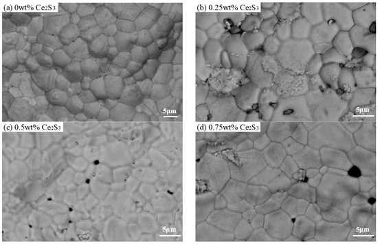 Figure 4 shows the SEM images of sintered Cu2S and Ce2S3-Cu2S at 500 °C. As the sintering temperature increased from 400 °C to 500 °C, the grain size of Cu2S became larger; this is similar to the synthesis of Cu2S nanoparticles via cyclic microwave radiation [32]. All samples exhibit distinct particle boundaries, and grain size is about 5–10 µm. As the Ce2S3 content increases, the particle size becomes increasingly uniform, which indicates that the introduction of Ce2S3 can make the particles uniform.