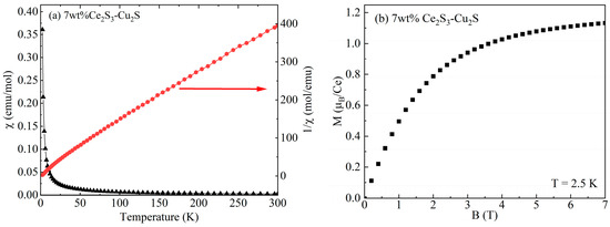 Figure 6b shows the variation of magnetization of 7 wt% Ce2S3-Cu2S measured at 2.5 K. The resulting saturation magnetization of Ce2S3-Cu2S is 1.2 µB/Ce, which is much lower than the theoretical magnetic moment of Ce3+ (2.45 µB) [34]. This may be caused by the coupling of the crystal field effect and the Kondo screening effect.