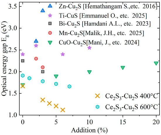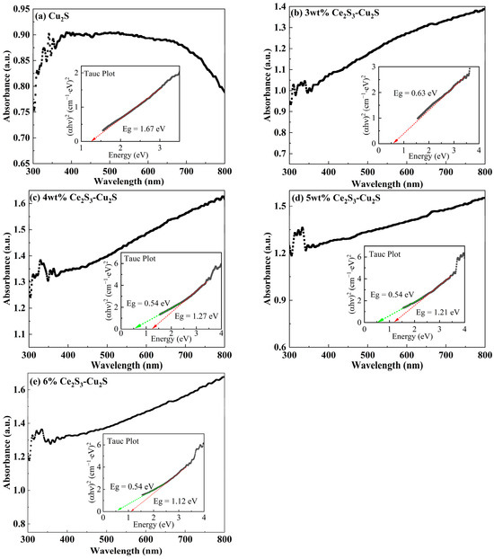 Figure 7 shows the UV-Vis Absorbance spectrum and the calculated optical energy gap plot of Ce2S3-Cu2S sintered at 400 °C. The absorption intensity increases with higher addition and stabilizes when addition exceeds 3 wt%. Cu2S displays its maximum absorption peak at 341 nm, while the peaks of Ce2S3-Cu2S shift to shorter wavelengths to varying extents. Similar behavior was observed by rare-earth Sm doping in Cu2SnSe3 and Gd doping on Cu2Sn1-xGdxS3 thin film system creates intermediate energy states that facilitate electron transitions [35,36]. From Figure 7, the Eg has been calculated to be 1.67 eV, 0.63 eV, 1.27 eV, 1.21 eV, and 1.12 eV for x = 0, 3, 4, 5, and 6 wt% Ce2S3, respectively. The value of 1.67 eV was consistent with the reported results [37,38]. When the addition of Ce2S3 exceeds 3 wt%, a second optical energy gap is present, with the second optical energy gap of 0.54 eV. This smaller optical energy gap of about 0.4–0.6 eV is between the Cu d valence and Cu s-like conduction bands, which is related to the hybridization of the Cu s and Cu d bands due to the symmetry breaking [30]. Combined with the XRD results (Figure 2), there are different crystal structures in the Ce2S3-Cu2S. The mixed hexagonal and monoclinic Cu2S phase determines both direct and indirect optical energy gap are present. The decrease in Eg with the increasing of the addition of Ce2S3 can be attributed to the 4f electrons (4f1) of Ce3+ ions. The 4f1 of Ce3+ ions are located at the middle of the optical energy gap of Cu2S semiconductors. When Ce3+ replaces Cu+ in the Cu2S lattice, its unfilled 4f electrons introduce new impurity levels into the original optical energy gap. As the Ce concentration increases, the distance between these localized 4f states decreases, causing the electron wave functions to overlap. This results in the isolated impurity levels expanding into a broader impurity band. The higher the doping concentration, the broader the impurity band, leading to a reduction in the measured Eg.
