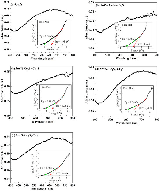 The UV-Vis Absorbance spectrum and calculated optical energy gap of Ce2S3-Cu2S sintered at 600 °C were shown in Figure 8. All the peak and minimum absorption peaks of Ce2S3-Cu2S are in the same wavelength interval. The 5 wt% Ce2S3-Cu2S peak absorption occurs at wavelength 292 nm, while the absorption peak of Cu2S occurs at wavelength 296 nm. The highest absorption peaks of 1 wt% Ce2S3-Cu2S, 3 wt% Ce2S3-Cu2S, and 7 wt% Ce2S3-Cu2S appeared at wavelengths 298 nm, 302 nm, and 308 nm, respectively. The calculated optical energy gap of Cu2S is close to 1.91, and the optical energy gap of 3 wt% Ce2S3-Cu2S and 5 wt% Ce2S3-Cu2S are 1.78 eV and 1.72 eV, respectively. This non-monotonic trend mirrors the similar effects in doped chalcogenides of competing influences of strain and defect states [39]. There is the second optical energy gap (0.88 eV) for Cu2S and Ce2S3-Cu2S sintered at 600 °C. The small optical energy gap of sintered Ce2S3-Cu2S at 600 °C (0.88 eV) is higher than that of sintered Ce2S3-Cu2S at 400 °C (0.54 eV). This small optical energy gap increases from cubic to hexagonal to monoclinic [30]. Combined with Figure 2, the higher the sintering temperature is, the higher the relative content of monoclinic Cu2S is.